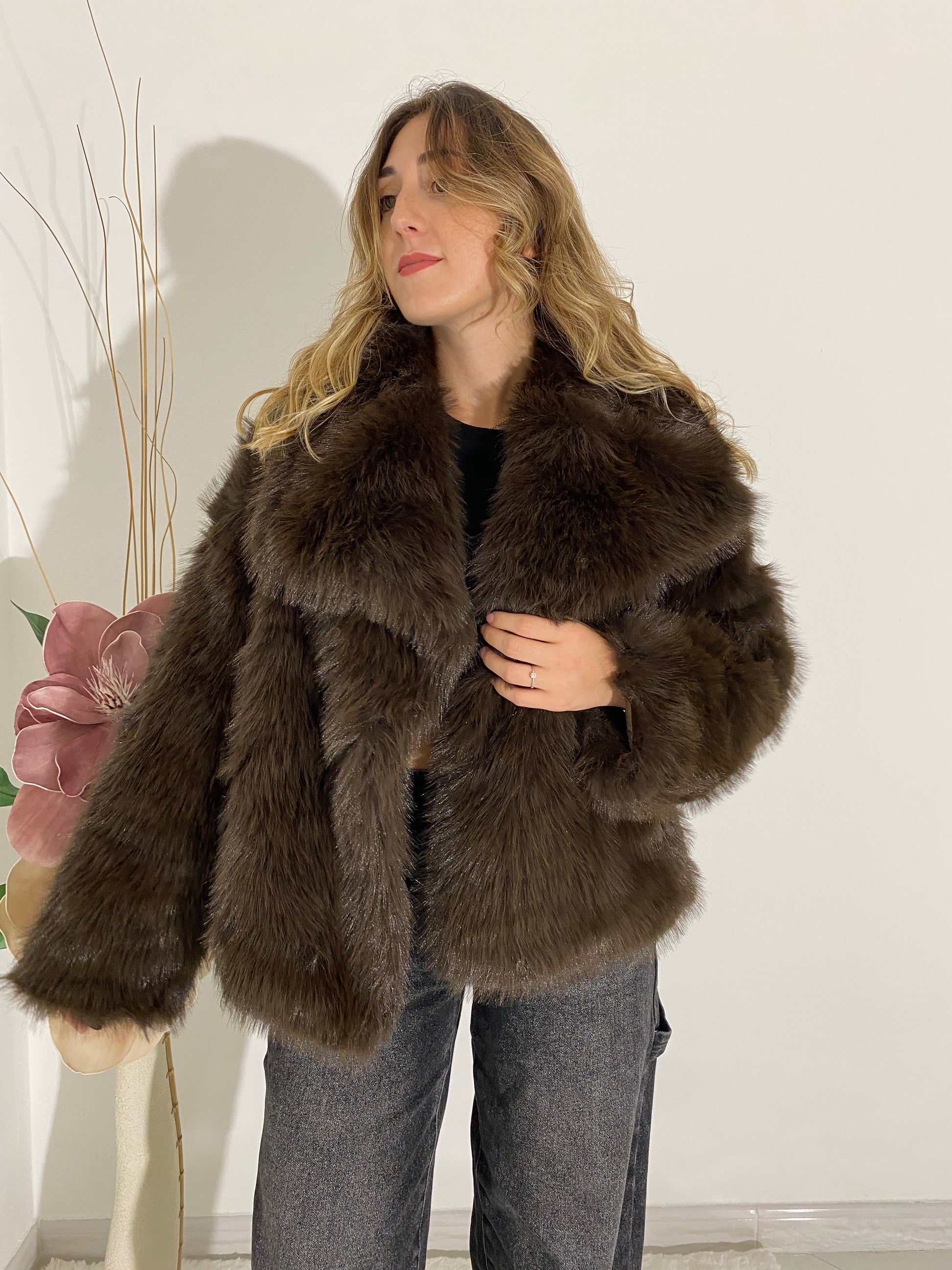 Eco-pelliccia con colletto ambio. Presenta due tasche laterali e chiusura con clip metallico. Molto morbido al tatto. Veste da una S a una L.