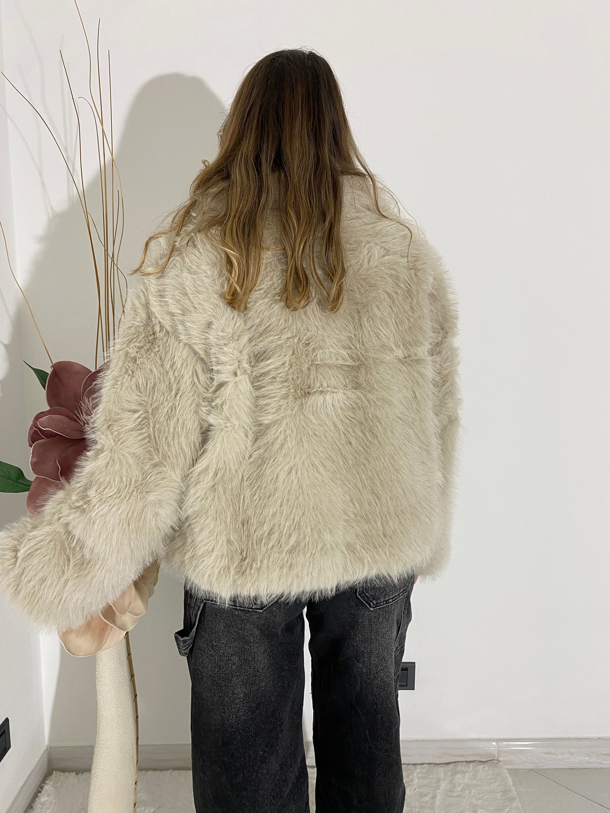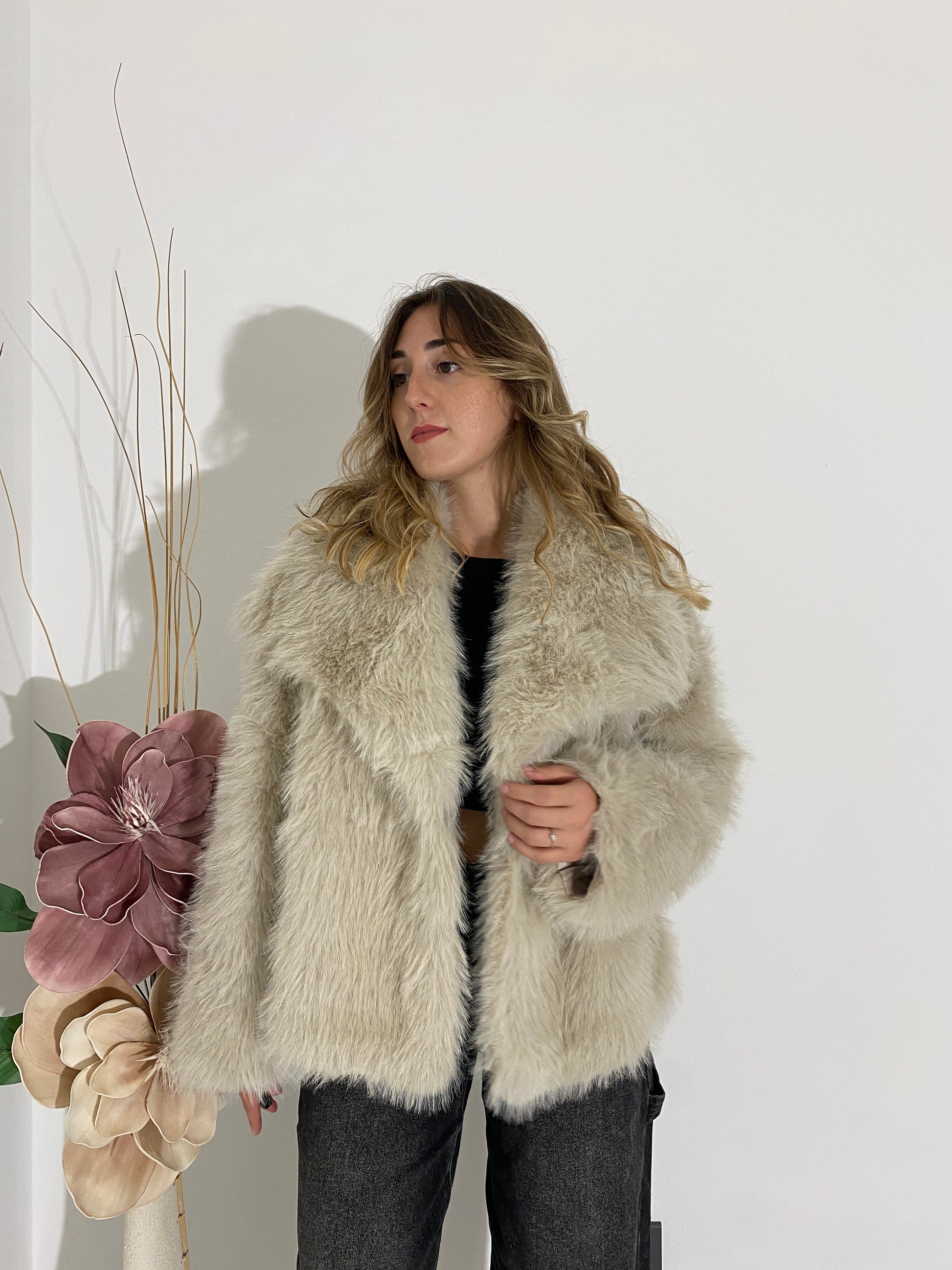 Eco-pelliccia con colletto ambio. Presenta due tasche laterali e chiusura con clip metallico. Molto morbido al tatto. Veste da una S a una L.