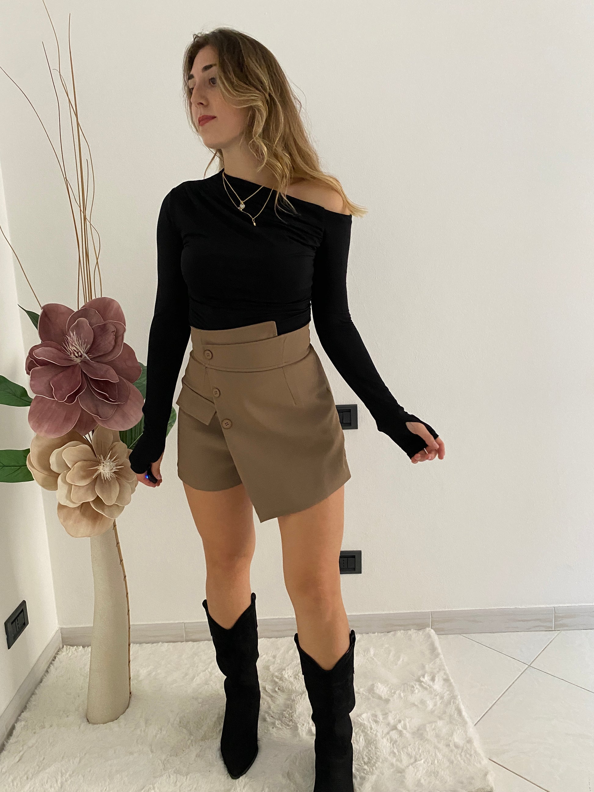 Maglia tessuto elasticizzato con scollo asimmetrico e drappeggi laterali.