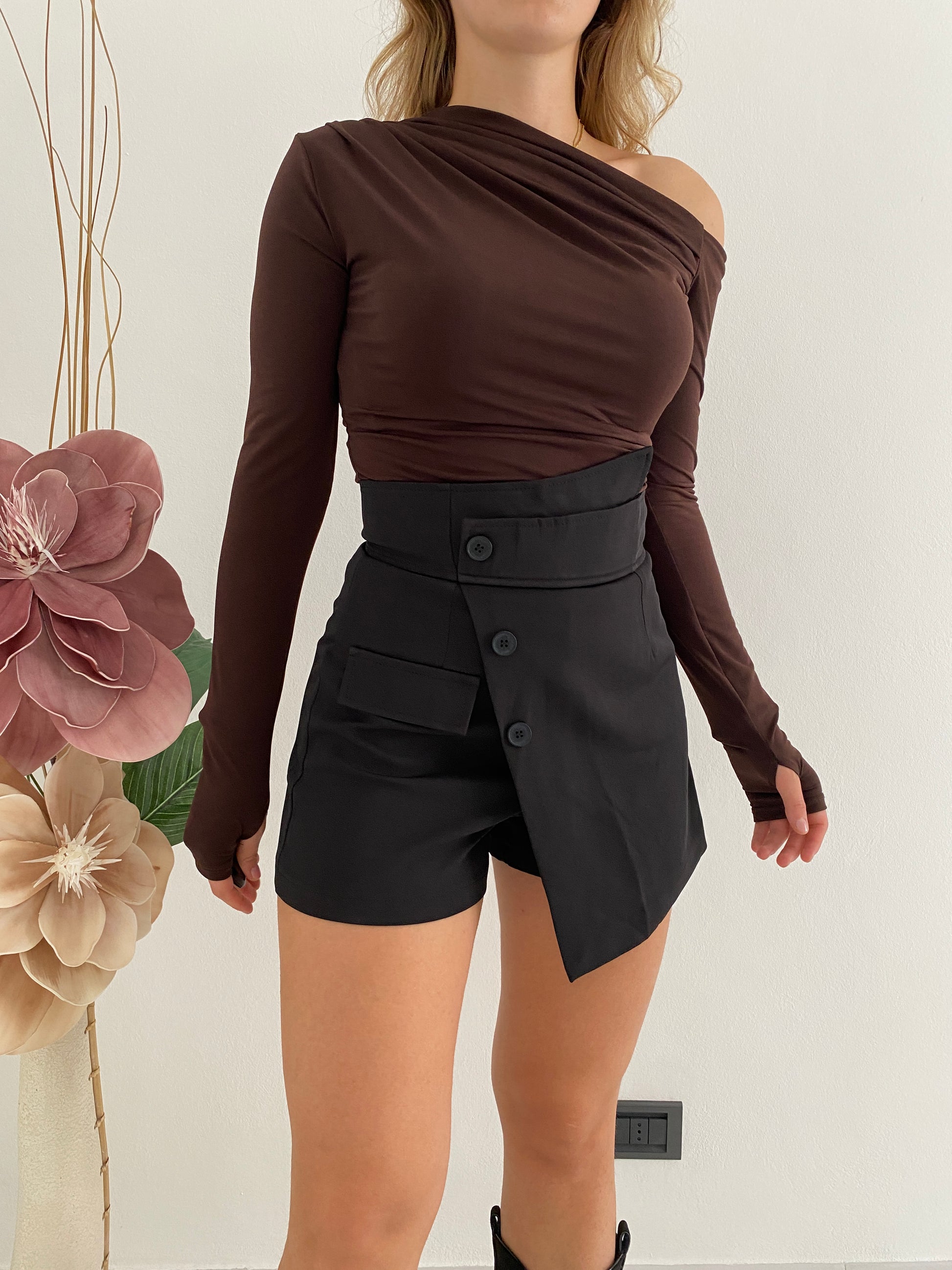 Pantagonna vita alta con bottoni frontali, bottoni trasversali tono su tono. Presenta tasca laterale, zip sul retro, se si oscilla tra due taglia si consiglia una taglia in più.